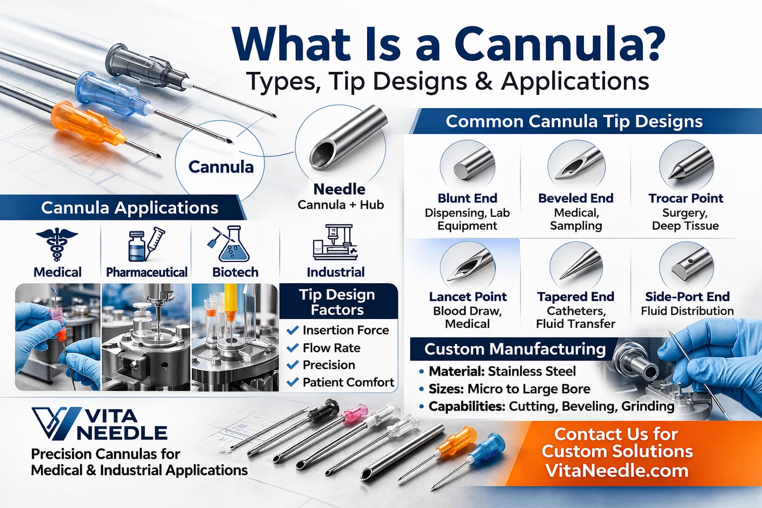 A cannula is a thin-walled tube with a small internal diameter that is often used to transport, dispense or remove fluids. Cannulas are frequently used in the medical field and are inserted into the body to deliver medicine, drain fluids or introduce a surgical instrument. Other industries use them by integrating them into systems for controlled fluid handling. Vita Needle manufactures precision cannulas for medical and industrial applications. A needle is an assembly that consists of a sharpened cannula attached to a hub for handling or connecting. The hub is the connector component, which provides structural support by securing a cannula in place and provides a connection point to syringes or other systems.