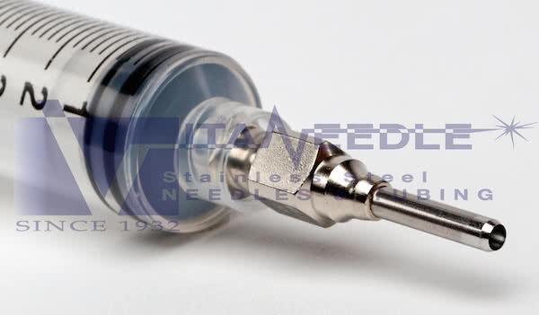 Disposable dispensing needle blunts, syringes, needle syringes, dispensing needles, bottles and equipment are sold non-sterile and bulk packed primarily for the industrial and institutional dispensing markets. These products are commonly found in most production, maintenance and laboratory operations where assembly and/or lubrication activities occur. The commodity nature of these products makes custom variations using identical components (pointed cannula, alternate tube sizes, different capacities, etc.) uncompetitive without high volumes. However, the use of metal hubs allows for cost-effective custom medical needles to be manufactured at a fraction of the time/money needed for an identical disposable product.